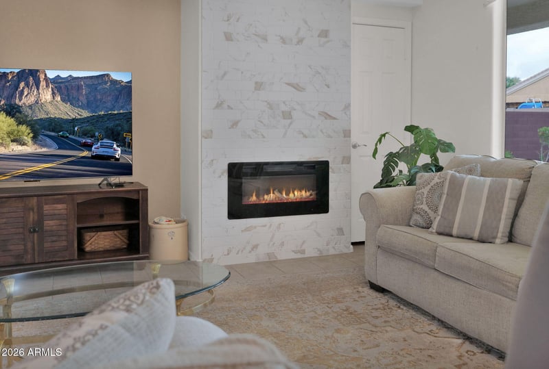 The backyard is an entertainer's dream with a pebble tec pool, spa, built-in BBQ, fire pit, turf, palm and fruit trees, and a covered patio that spans the full length of the home-perfect for enjoying Arizona's beautiful weather year-round..