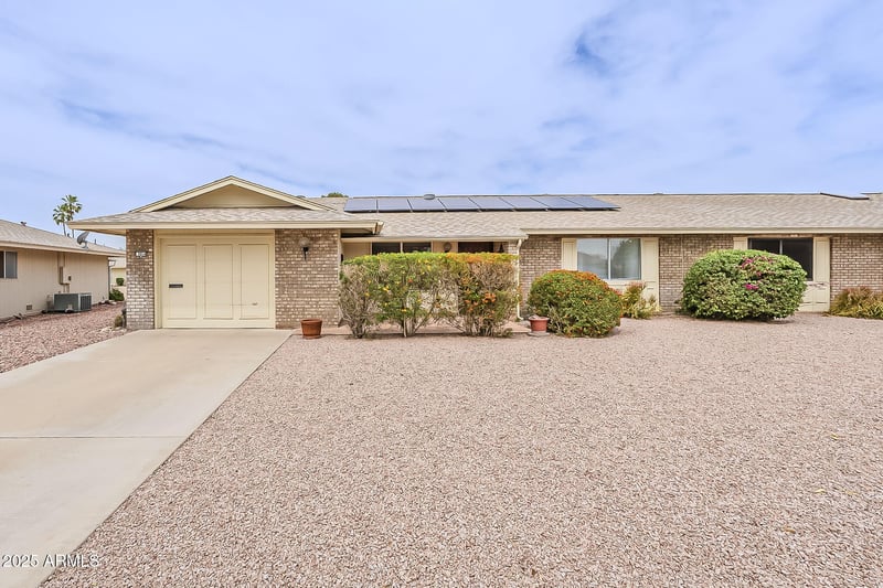 Listing details for 9814 Long Hills Dr, Sun, AZ 85351 : Immaculate Move-In Ready Condo/Twin Home! This beautifully maintained home offers 2 generously sized bedrooms, 2 spacious bathrooms, and a versatile 1.5-car garage—perfect for a vehicle and golf cart. Recent upgrades include a new A/C compressor (January, 2025), sleek stainless steel appliances, new carpeting, updated light fixtures, and low-maintenance desert landscaping in the front yard.