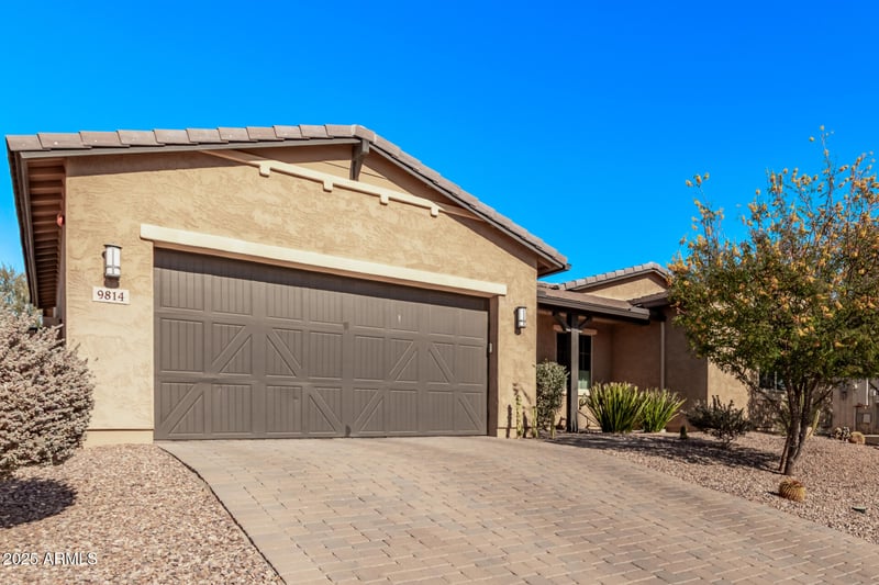 Listing details for 9814 Rowel Rd, Peoria, AZ 85383 : This popular Lancaster plan is located in North Peoria's beautiful and gated for privacy, Stonebridge Ranch community. A spacious home with ten-foot ceilings, four bedrooms, 2.5 baths, a large flex room, showcases ceramic wood-like floor tiles, 2824 sq ft, a 12 foot slider off the great room and a French door in the primary bedroom leading to a relaxing mature backyard and a three-car garage. Driveway and walkway pavers, custom iron gates, and a relaxing courtyard lead into this expansive home. Amenities include an upgraded gourmet kitchen featuring striking cabinets, a generous double- sided island, granite countertops, high-end built-in stainless steel appliances, a walk-in pantry, and a large breakfast room. North South exposure with quick access to the 303 Loop and great nearby shopping and restaurants