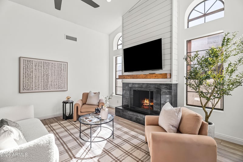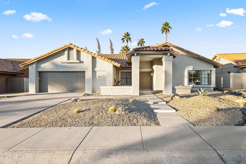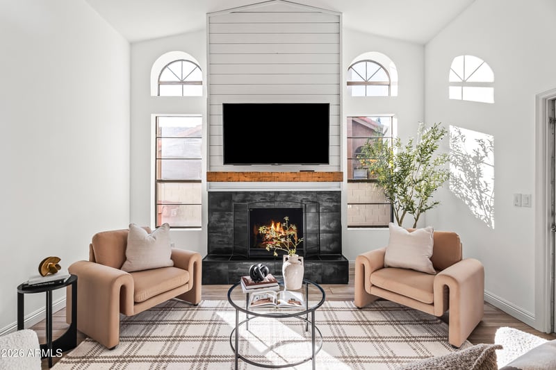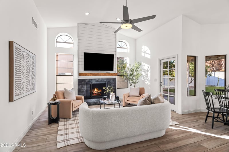 Listing details for 9822 Wood Dr, Scottsdale, AZ 85260 : Tucked within the highly sought-after Sweetwater Ranch community, this beautifully refreshed 4-bedroom, 2-bath residence delivers turnkey living with timeless style and effortless indoor-outdoor flow. Recently updated with fresh interior paint and new carpet, the home feels light, clean, and move-in ready from the moment you step inside. The open-concept layout centers around a well-appointed kitchen featuring soft-close cabinetry, a generous entertaining island, stainless steel appliances, granite countertops, and a modern tile backsplash — seamlessly connecting to the inviting family room anchored by a striking fireplace with wood beam mantle and vaulted ceilings. The backyard has been thoughtfully reimagined for low-maintenance enjoyment, showcasing new turf, pavers, and desert-friendly landscaping that frame a sparkling pool ideal for relaxing, entertaining, or soaking up Arizona sunshine year-round. The spacious primary suite offers a private retreat with an updated bath and walk-in closet, while additional highlights include wood-plank tile flooring, shiplap accents, epoxy garage floors, exterior rolling shutters, and designer details throughout. Perfectly positioned near top-rated schools, dining, shopping, and outdoor recreation, this Sweetwater Ranch gem blends comfort, style, and livability in one exceptional offering. A must see!