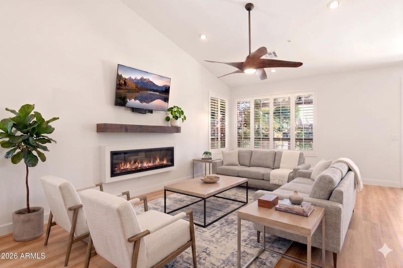 Listing details for 9827 Blanche Dr, Scottsdale, AZ 85260 : Stylishly updated 3 bedroom, 2 bath home in North Scottsdale offering a bright, open floor plan and a series of thoughtful upgrades throughout. Recent improvements include a renovated kitchen & bathrooms, quartz countertops, new electric fireplace, updated flooring, and dual pane windows. Designed with ease of living in mind, all entry points are zero grade or ramped for wheelchair accessibility, and the primary bath features an ADA-compliant tub and shower. The backyard presents a true private retreat with lush landscaping, turf, a covered patio with powered sunshade, and a built-in grill making it ideal for effortless entertaining. Positioned in a prime North Scottsdale location near amazing shopping, dining, and neighborhood parks.