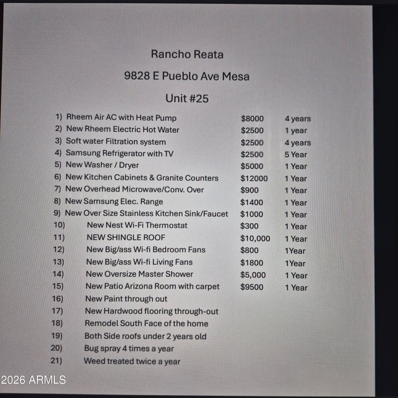 Listing details for 9828 Pueblo Ave #25, Mesa, AZ 85208 : This beautifully maintained 1985 Cavco double-wide manufactured home offers 1,248 sq. ft. plus a spacious 480 sq. ft. Arizona room. Inside you'll find an elegantly updated kitchen with custom refrigerator and top-end appliances, along with a remodeled primary bath featuring an oversized walk-in shower. With three bedrooms, this home provides comfort and functionality. Located in the desirable 55+ Rancho Reata community in Mesa, enjoy resort-style amenities including a sparkling pool, clubhouse, and fitness center. Residents love the clean, well-kept grounds and the welcoming, professional staff. A wonderful opportunity in a vibrant setting!