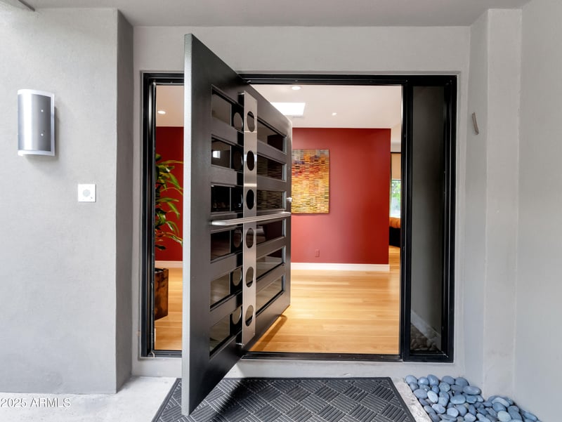 From the moment you arrive, you're greeted by a true work of art—the custom hammered steel pivot front door sets the tone for the craftsmanship found throughout the home. Step inside and you'll be welcomed by soaring ceilings and celestial windows that bathe the interior in natural light.