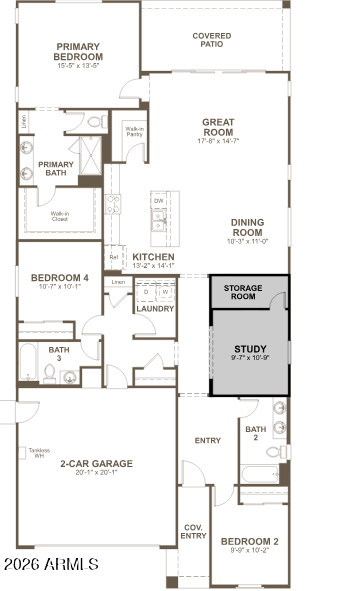 An open den with a storage closet provides flexible space for a home office or media room. The private owner's suite includes a walk-in closet and an ensuite bath, with additional bedrooms offering versatility for guests or work-from-home needs.
