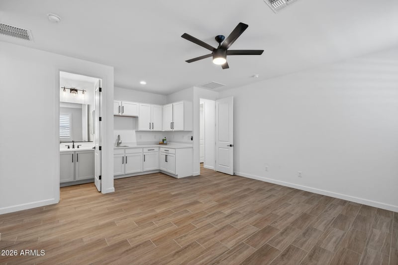Listing details for 9841 Satellite Dr, Mesa, AZ 85212 : Located in the heart of Eastmark, this home instantly stands out with beautiful curb appeal and low maintenance landscaping. The exterior paint paired with crisp white shutters creates the perfect first impression. Inside, wood look tile flows throughout the main living areas, complemented by white wood shutters that keep the space bright and timeless. The kitchen stands out with a two toned design featuring gray shaker cabinets on the island which pairs beautifully with white shaker cabinets throughout the rest of the space. It's finished with upgraded black modern hardware, quartz countertops, a gas range, a single apron sink, and extended cabinetry into the dining area, providing both style and extra storage. Each bedroom offers plush carpet that has been recently refreshed. The primary suite feels like a retreat with white shaker cabinetry in the primary bathroom accented by black hardware and a spacious walk in closet. One of the standout features of this home is the private guest retreat, complete with its own living area, wet bar, and upgraded bathroom. Perfect for visitors, multigenerational living, or a private flex space. The 2.5 car tandem garage includes epoxy flooring, offering both function and a polished finish. Out back, the backyard is designed for entertaining with low maintenance turf that allows you to enjoy the space without the upkeep.This Eastmark gem blends comfort, convenience, and thoughtful design with all the perks of community living. Eastmark offers a true resort style lifestyle with a luxurious pool, splash pads, parks, Steadfast Farm & Diner, and the impressive Mark clubhouse that hosts events and activities year round. This is more than a home, it's a lifestyle you won't want to miss.