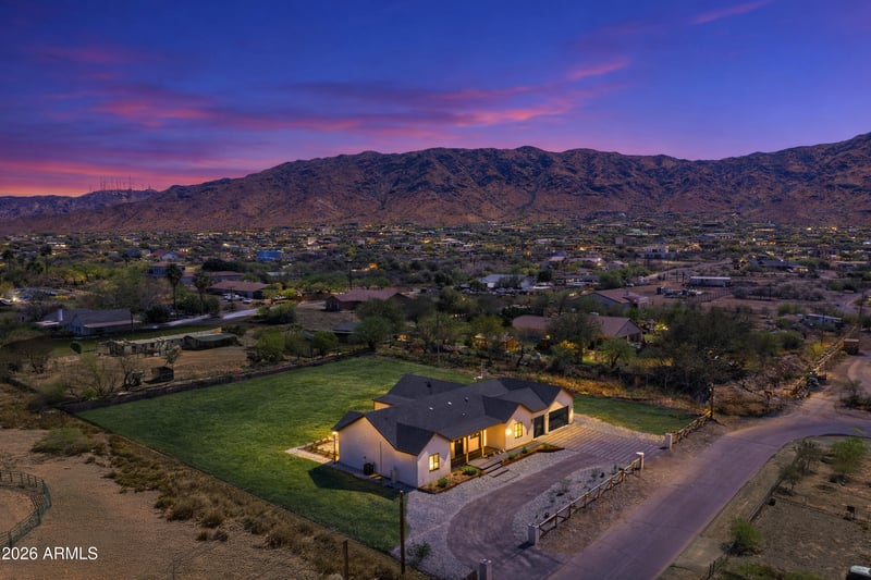 Listing details for 9845 31st Ave, Laveen, AZ 85339 : 2024 custom 4 bed, 2.5 bath home on nearly 1 acre in Laveen with a rare off-grid feel, shared well, SRP flood irrigation, septic, propane, and no HOA. Slightly elevated lot enjoys valley views. Inside, soaring 10+ ft ceilings, open floor plan, fresh interior paint, vinyl flooring throughout, flush-mounted Sonance/Sonos speakers, and designer finishes throughout. The kitchen features upgraded custom cabinetry, quartz countertops, Wolf range, and a huge island with breakfast bar seating. Spa-like primary bath features a freestanding soaking tub and glass-enclosed walk-in shower with floor-to-ceiling tile. Finished 3-car garage offers epoxy flake floors, extensive built-in cabinetry, and an extra-long multi-station workbench with drawers. Custom front/back paver design completes the property.