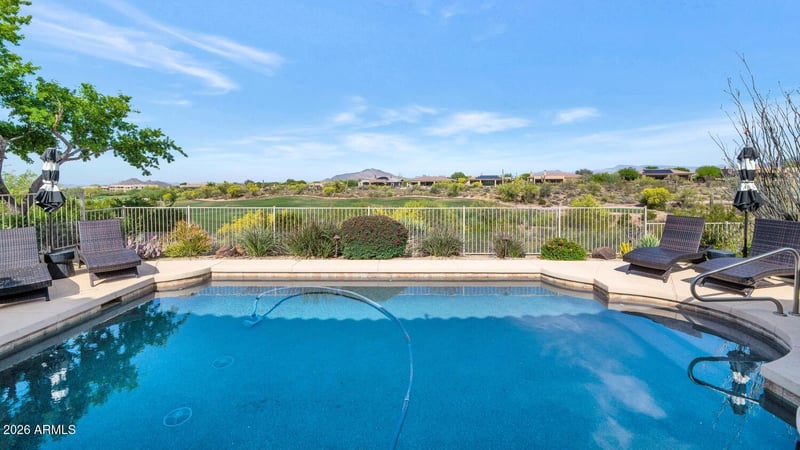 Listing details for 9860 Roadrunner Dr, Scottsdale, AZ 85262 : Premium elevated golf course lot with expansive GOLF, MOUNTAIN, and SUNSET VIEWS! This home boasts an open floor plan w/ 4 Bedrooms plus an Office, and a 3 Car Garage in highly desirable Legend Trail. Kitchen includes updated lighting, gas cooktop, granite countertops, a wet bar with wine fridge, a butler's pantry, and a 2nd built-in fridge in laundry room. Huge master suite with views and access to pool. Guests will enjoy the privacy of the split bedroom floor plan. Two of the guest rooms have spacious walk-in closets. The private backyard features a heated pool and spa, large covered patio with a stacked stone fireplace, built-in BBQ, retractable awnings, built-in heaters, and multiple seating areas to enjoy the views. NEW ROOF 2022, Exterior Paint 2024, Water Heater 2025. Community amenities include 2 heated pools and a spa, tennis, pickleball, fitness center, walking paths, and so much more. The Legend Trail Golf Club offers an impressive 18-hole course and a casual restaurant. Residents can select from multiple annual passes and loyalty cards for the golf course. Inquire with Legend Trail Golf Club for more info.