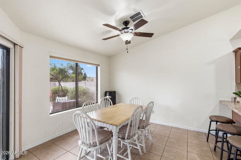Listing details for 9887 Del Monte Ave, Gold Canyon, AZ 85118 : Mountain Views & No HOA in Gold Canyon! Lovely family home with vaulted ceilings & a statement fireplace anchoring the living room, creating a bright, open feel. Just beyond, the eat-in area with sliding door to the backyard flows into the kitchen featuring stainless steel appliances, pantry & breakfast bar seating. The primary suite offers vaulted ceilings, French doors to the backyard & an ensuite with double vanities & a walk-in closet. Two additional bedrooms are nicely sized, each with vaulted ceilings. The backyard includes a covered patio, attached pergola, extended pavers, block fencing, backing to a small wash/alleyway for added privacy & plenty of room to customize. Conveniently located just minutes from shopping, dining, easy access to Hwy 60 & multiple nearby hiking trails.