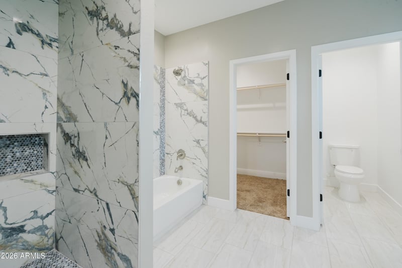 Listing details for 9917 Arvada Dr, Arizona City, AZ 85123 : Modern home featuring stylish finishes throughout. Carpeted bedrooms provide comfort, while tile flooring extends through the living room, kitchen, hallways, and bathrooms for a clean, cohesive look. The home offers abundant storage space, including a spacious walk-in closet in the primary bedroom.