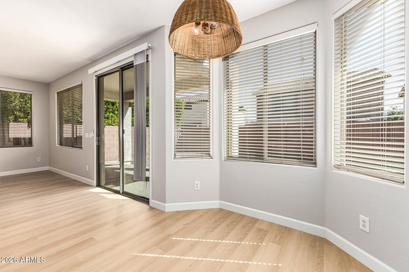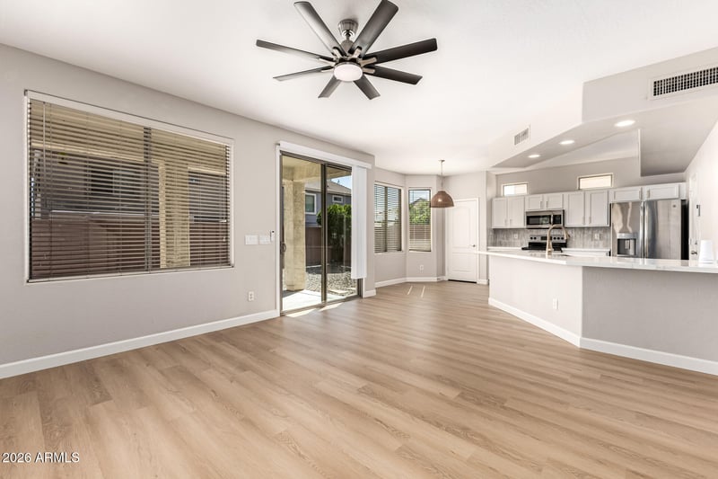 Listing details for 9923 Edgewood Ave, Mesa, AZ 85208 : Bright, stylish, and designed for easy living, this Mesa home offers the kind of comfortable, move-in-ready feel buyers are looking for. Natural light pours into the open main living areas, where a fresh neutral palette, wood-look flooring downstairs, and plush carpet upstairs create a warm, polished backdrop for everyday life. The flowing layout makes it easy to relax, gather, and entertain, while the kitchen stands out with stainless steel appliances, quartz countertops, tile backsplash, recessed lighting, ample white cabinetry, and a peninsula with breakfast bar seating. A cozy dining area with a bay window adds charm and everyday functionality. All bedrooms are tucked upstairs for added privacy, including a spacious primary suite with double-door entry, an en suite bath, and walk-in closet. Outside, the backyard offers a covered patio and inviting space to unwind or host friends with ease. Built in 2006 with a 2-car attached garage, this 3-bedroom, 2-bath home combines thoughtful design, clean finishes, and practical comfort at an appealing price point.