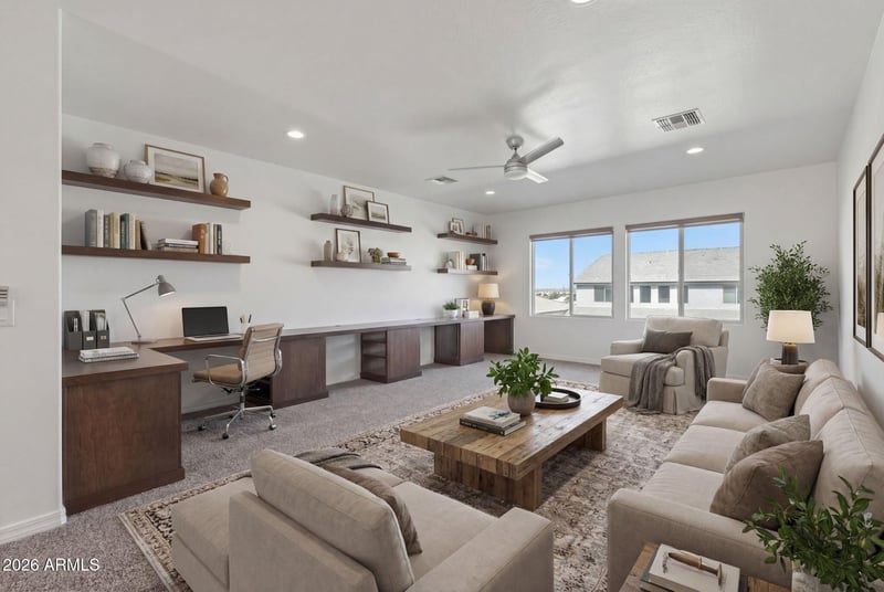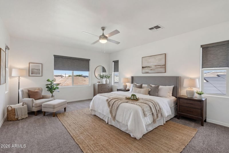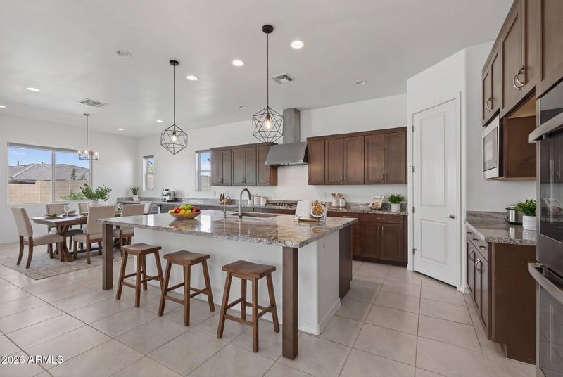 Listing details for 9960 Seismic Ave, Mesa, AZ 85212 : Absolutely stunning, move-in ready Maracay home in the highly desirable, award-winning master-planned community of Eastmark in Mesa, Arizona! This meticulously maintained, highly upgraded 5-bedroom, 4.5-bathroom residence, featuring a spacious loft and a 4-car tandem garage offers luxurious modern living in one of Mesa's premier neighborhoods. Step into a grand two-story entrance that's light, bright, and open, with fresh newly painted interiors throughout for a crisp, contemporary feel. The main level includes a versatile generation suite (ideal as a casita or in-law quarters) featuring its own private entrance, bedroom, full bathroom, sitting room, and washer/dryer hookups--perfect for multigenerational living or guests. The gourmet chef's kitchen is a true entertainer's dream, boasting abundant extended cabinetry, an oversized island with elegant pendant lights, sleek granite countertops, premium stainless steel appliances, a 5-burner gas cooktop, a range hood, a wine refrigerator, double wall ovens, and convenient pot-and-pan drawers under the cooktop. Flow seamlessly into the oversized family room with panoramic double sliding glass doors that open to the extended covered patio, creating abundant natural light and effortless indoor/outdoor living. This layout keeps you connected--whether cooking, relaxing in the living area, or enjoying the backyard. Upstairs, enjoy a generous loft with built-in wood desks and storage--ideal for a home office, homework station, or game room. The private master suite showcases breathtaking Superstition Mountains views, separate his-and-hers vanities, a luxurious soaking tub, separate shower, and an expansive walk-in closet. Three additional bedrooms share two full bathrooms (including a convenient Jack-and-Jill setup with shower/tub combos). Outside, the professionally landscaped backyard is an inviting low-maintenance oasis: lush synthetic grass, paver walkways, mature citrus trees, and plenty of side yard space for a dog run, storage, or future expansions. The extended covered patio provides ample room for outdoor seating, dining, and relaxation. Additional premium upgrades include tile flooring downstairs, a whole-home water softener and RO system, tankless water heater with recirculator, roll-up window coverings (most blackout), upgraded lighting fixtures, floating garage storage, and a desirable North/South exposure lot. Eastmark delivers an unmatched lifestyle with over 40 neighborhood parks, a community clubhouse/rec center, heated resort-style pool, splash pad, basketball courts, sand volleyball, ball fields, dog park, sustainable farm for fresh produce, the iconic Handlebar/Steadfast Diner, extensive biking/walking trails, catch-and-release fishing pond, frisbee golf, skate park, and year-round community events like Easter parties, Halloween festivities, free concerts in the park, and food truck nights. Exciting news for future convenience: The highly anticipated EastMarket retail development is underway right in the heart of Eastmark (at Ellsworth and Ray roads), anchored by a new Sprouts Farmers Market and featuring nearly 45,000 square feet of additional retail and restaurant space. Construction is progressing, with completion expected around mid-2026 and Sprouts opening in late 2026--bringing elevated shopping, dining, and neighborhood amenities even closer to home! Enjoy convenient access to Dignity Health Hospital, The Point shopping center, top-rated schools (BASIS Mesa, Sequoia Pathfinder Academy, Gateway Polytechnic Academy, and Eastmark High School), major freeways, and abundant shopping/dining.