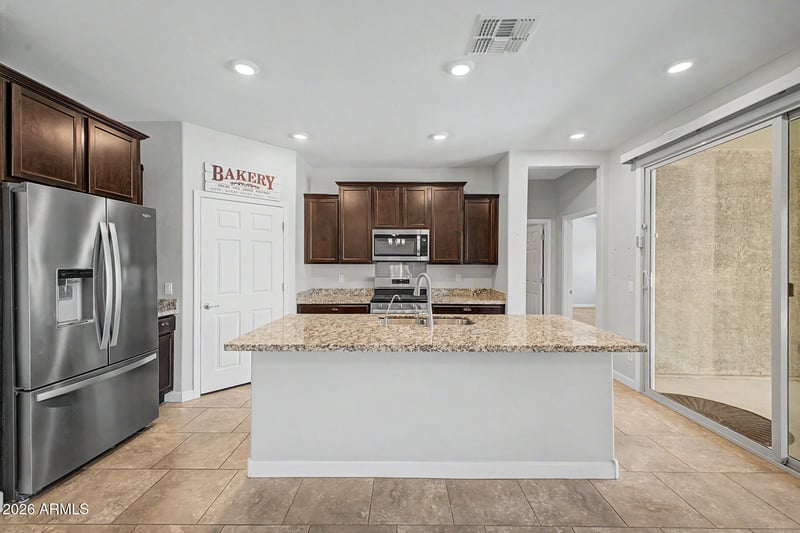 Listing details for 9978 Saguaro Bloom Way, Marana, AZ 85653 : From the moment you step through the front door, your eyes are drawn straight down the hallway to the double glass sliding doors, where a breathtaking backdrop of mountain views instantly steals the show. This beautifully designed 2 bedroom plus bonus room, which could easily serve as a third bedroom or private office, offers 2.5 baths and is located in the gated 55 plus community of Saguaro Springs. As you move into the heart of the home, the great room opens up with tile flooring, soft neutral tones, and natural light pouring in from the wall of glass. The kitchen is both functional and inviting, featuring granite countertops, stainless steel appliances, a pantry, rich cabinetry with crown molding, and a large center island with breakfast bar seating, perfect for casual dining. The primary suite is tucked away for privacy, offering plush carpet, a generous walk-in closet, and a well-appointed bath with dual sinks. A secondary bedroom and additional full bath provide comfortable space for guests.