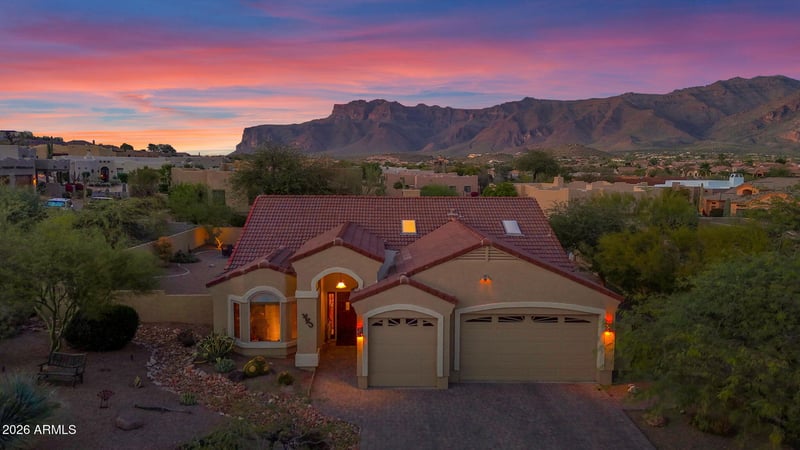 Listing details for 9982 Fools Gold Pl, Gold Canyon, AZ 85118 : IMMERSE YOURSELF IN THE STUNNING VIEWS OF DINOSAUR MTN AND SUPERSTITION MTNS. COME HOME TO A PERFECT 4 BEDROOM, 2 BATH SINGLE LEVEL HOME WITH 3 CAR GARAGE, SET ON A CDS LOT AT THE BASE OF DINOSAUR MTN. RELAX IN YOUR OWN PRIVATE POOL SURROUNDED BY SYNTHETIC GRASS, OPEN DECK PATIO, BUILT-IN GAS BBQ AND ACCENT LIGHTING. EASY LIVING IN THIS UPDATED HOME WITH REMODELED BATHS, EXPANDED MASTER SHOWER, NEW RANGE, DISHWASHER AND COUNTERS ALL REPLACED IN KITCHEN. NEW ROOF IN 2023, NEW WATER HEATER IN 2023, NEW OUTSIDE PAINT IN 2022, ALL NEW WEATHERSBY WINDOWS IN 2020, NEW DRIVEWAY/ ENTRY OF PAVERS, ALONG WITH SIDE WALK OF PAVERS IN 2024, NEW BBQ IN 2024, EASILY MAINTAINED DESERT LANDSCAPING FRONT AND BACK WITH ACCENT LIGHTING. THIS HOME INCLUDES BEDS, SOFA, CHAIRS, DINING TABLE/CHAIRS AND MUCH MORE