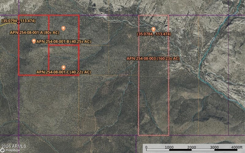 Listing details for XXXXX Knight Creek Rd #1-A, Kingman, AZ 86401 : Online auction opportunity: 160± acres offered in 3 separate parcels in Fort Rock Ranches, Mohave County near Kingman, AZ. Buy one parcel or buy all three. Bidding starts at $500/Acre. Property is bordered by State Trust land to the north and west with scenic rock formations and excellent privacy. Ideal for recreation, hunting, or off-grid living. Access via dirt roads; 4x4 recommended due to remote location. Gated access at the northwest corner; fencing runs along the west side of Parcel A only. No HOA and no floodplain. Septic required, water by haul or private well. Neighboring wells indicate relatively shallow water depths. Very low annual property taxes. Online bidding ends Wednesday, March 25, 2026, at 6:00 PM Arizona time. Online land auction featuring 160± acres in Fort Rock Ranches, Mohave County, Arizona, offered in three individual parcels. Parcels may be purchased separately or together. The property is located in a remote, quiet area near Kingman and is bordered by Arizona State Trust land to the north and west, providing long-term privacy and open views. Distinctive rock and sandstone formations are located along the northern boundary.